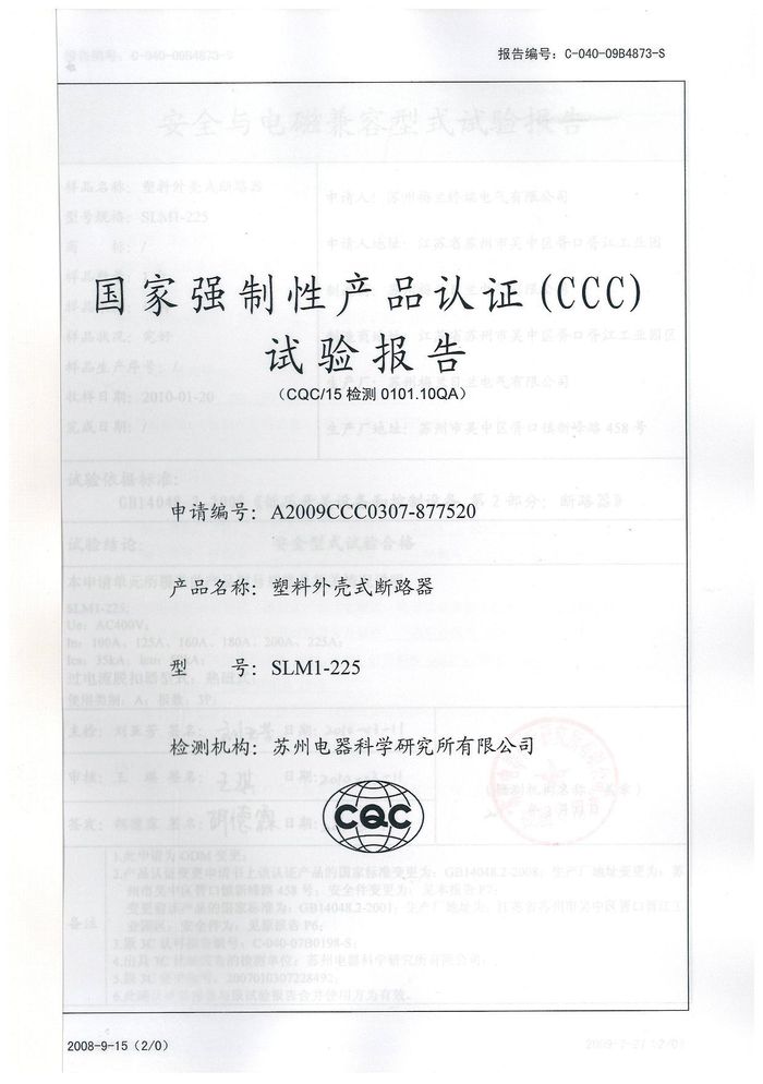 SLM1-225塑殼斷路器資質(zhì)證書