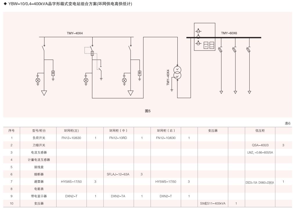 本變電箱高、低壓?jiǎn)卧捎媒M合式柜.按所需要接線組合成高、低壓配電系統(tǒng)常用高、低壓柜的接線方案均可選用,同時(shí)高壓?jiǎn)卧挚山M合成環(huán)網(wǎng)型式等。(見表4、表5)
