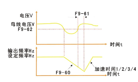 此功能指在瞬時停電時變頻器不會停機(jī),在瞬間停電或電壓突然降低的情況下,變頻器降低輸出速度,通過負(fù)載回饋能量,補(bǔ)償電壓的降低,以維持變頻器短時間內(nèi)繼續(xù)運(yùn)行。